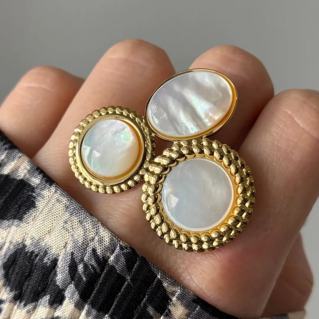 Bijou doré de 3 éléments nacre iridescente: deux ronds, un ovale. Bords texturés torsadés. Sur un doigt, vêtement imprimé.