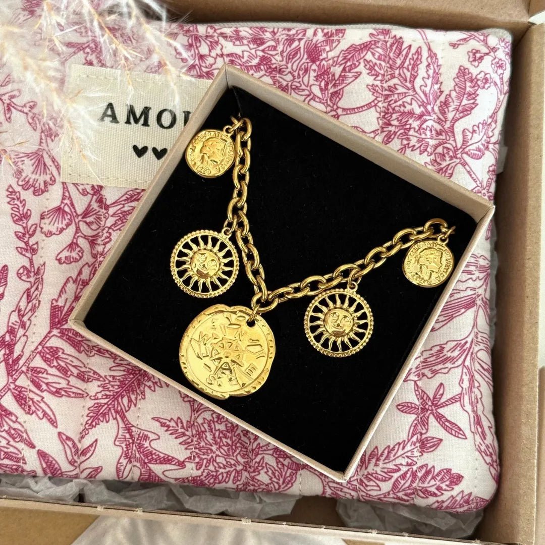 Bracelet chaîne dorée avec 2 charmes soleils, 2 médailles visages, 1 rose des vents, dans sa boîte noire sur tissu toile de Jouy.